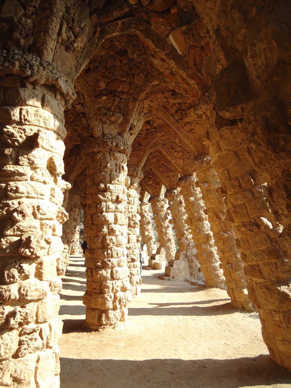 As ruas que Gaudi projetou para o Parc Güell me fazem pensar muito na minha infância, quando "viajava" pelas pelas ruas de Pedrock com os Flintstones. A única coisa que falta é o carro movido a pés. Quando vi pela primeira vez uma foto da Igreja Sagrada Família, me lembrou imediatamente das torres que fazia na praia. Pegava areia bem molhada de um buraco que cavava e deixava escorrer das mãos formando uma torrezinha irregular. Parece que uma mão gigantesca deixou escorrer estas torres Acho que gosto tanto de seu trabalho porque ele realiza fantasias da minha infância.Oliveira no Parc Güell